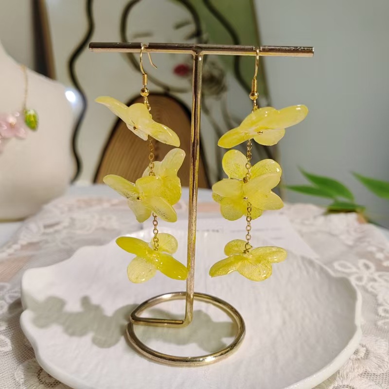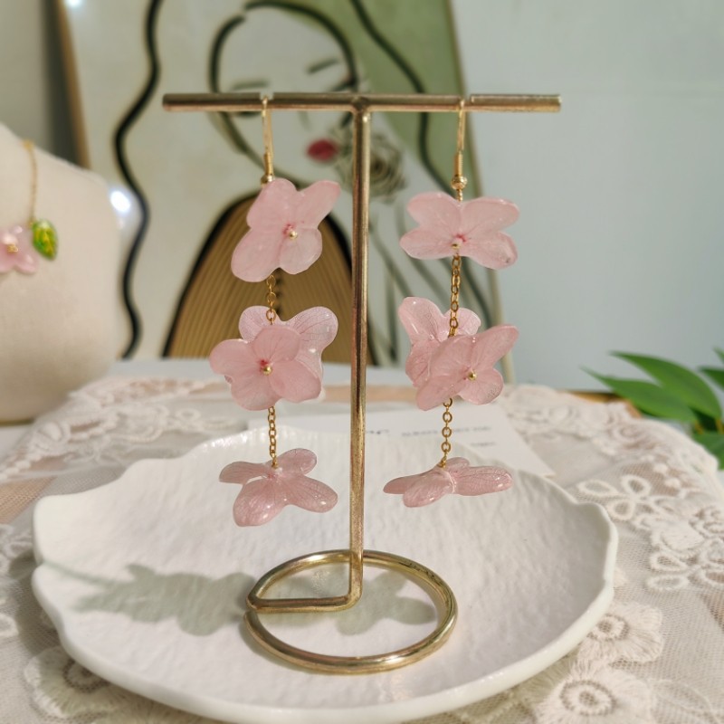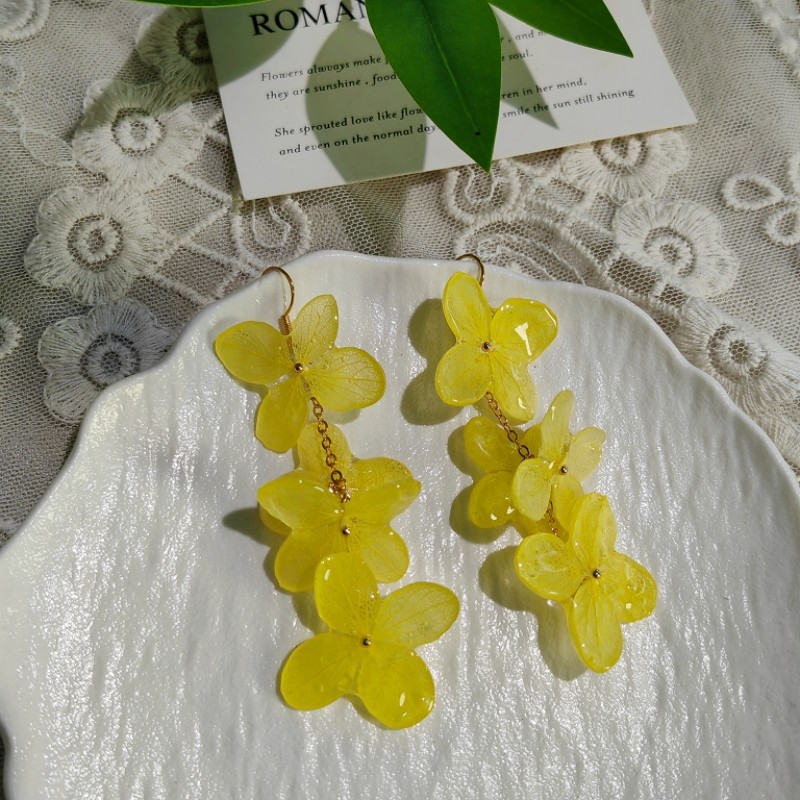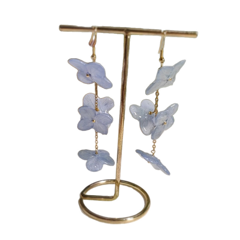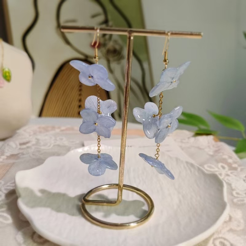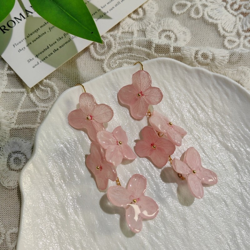 Step into a garden of timeless beauty with our 4-Cluster Resin Hydrangea Drop Earrings. These exquisite long dangle earrings feature four distinct preserved hydrangea florets, artfully arranged and encased in crystal-clear resin. Accented with delicate pearls, they create a romantic and 'fairy-like' aesthetic that is perfect for adding a touch of nature's charm to your look.