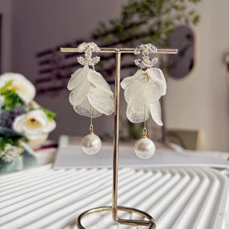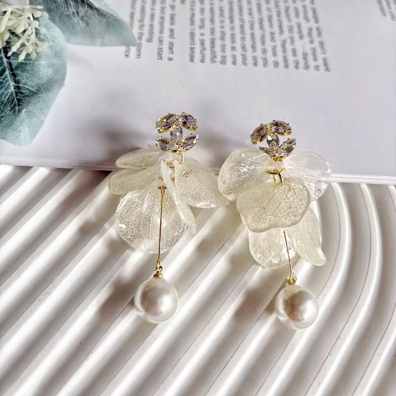 French Style Hydrangea Petal Tassel Earrings - Real Flower Long Drop Jewelry