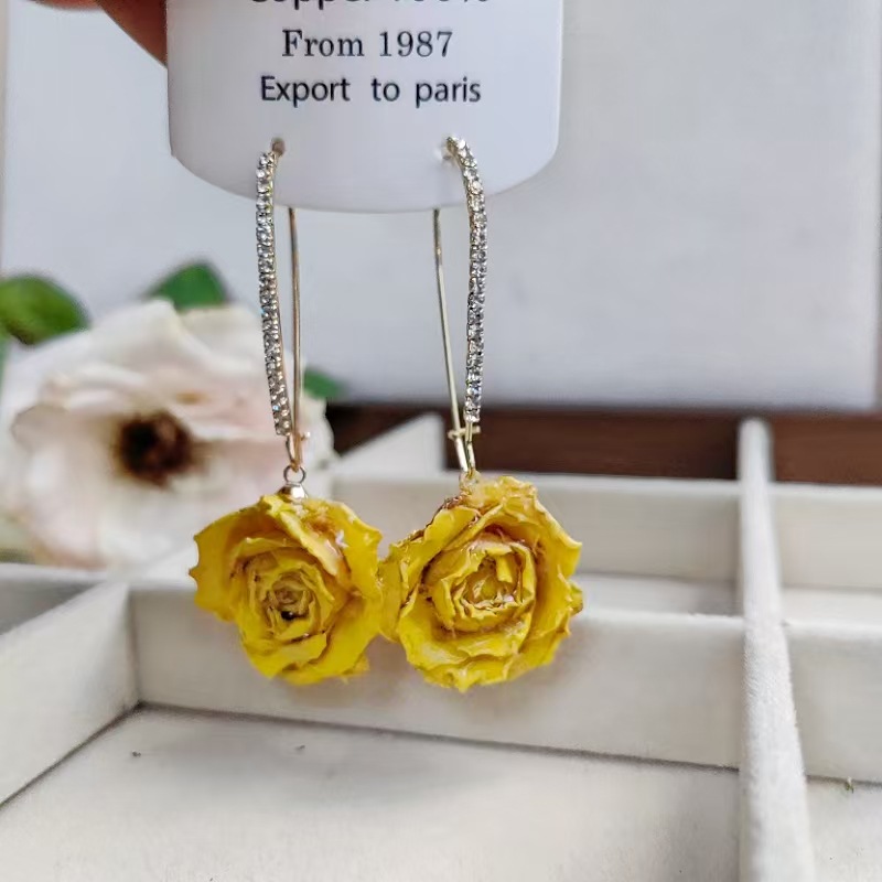 Product information "French Style Rhinestone Rose Earrings - Real Flower Wire Dangle Jewelry"