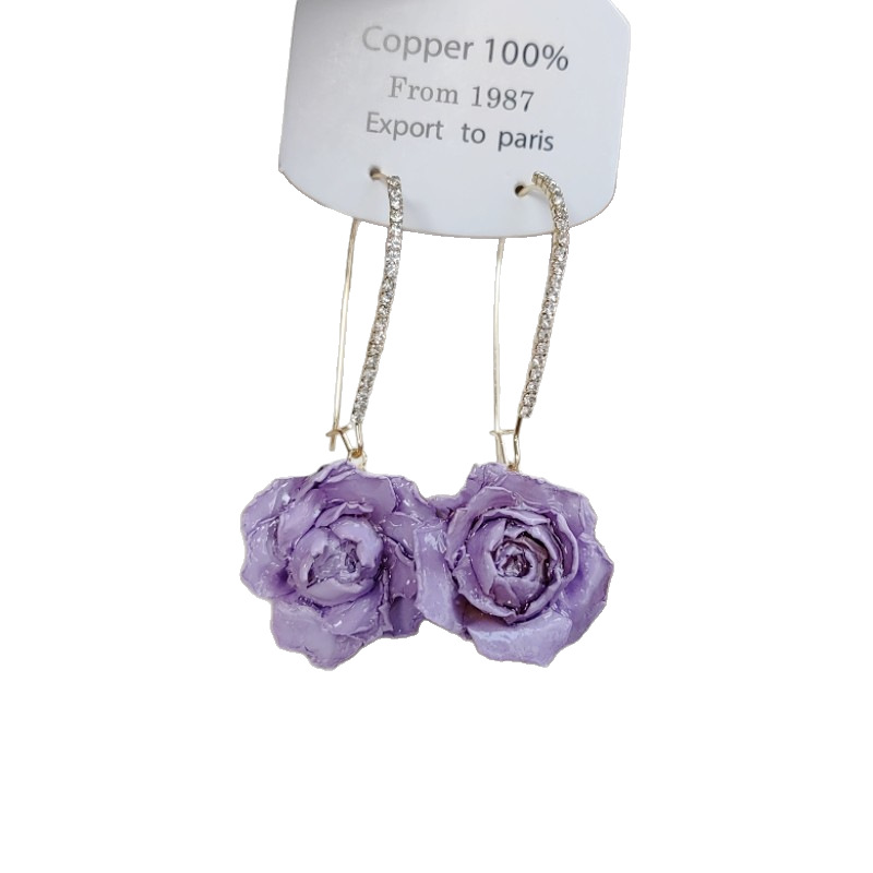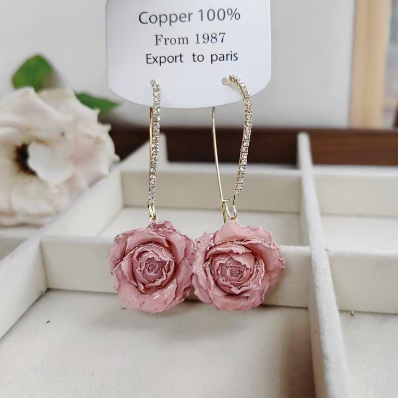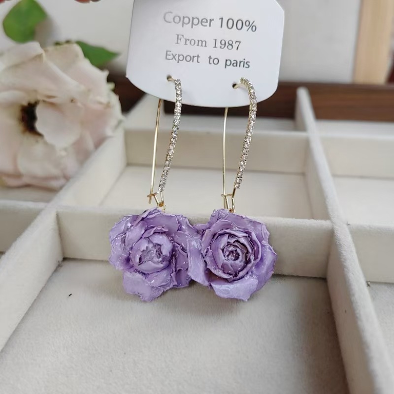 French Style Rhinestone Rose Earrings - Real Flower Wire Dangle Jewelry