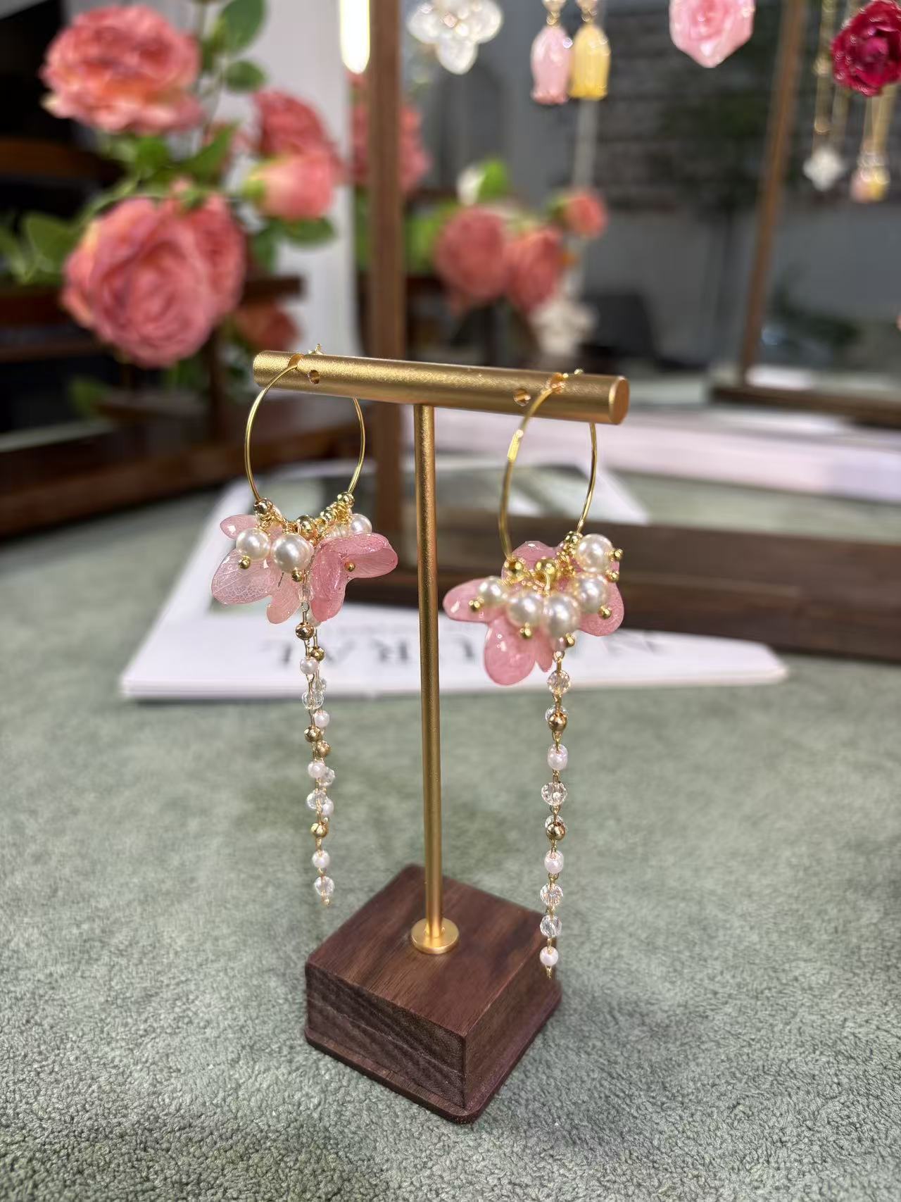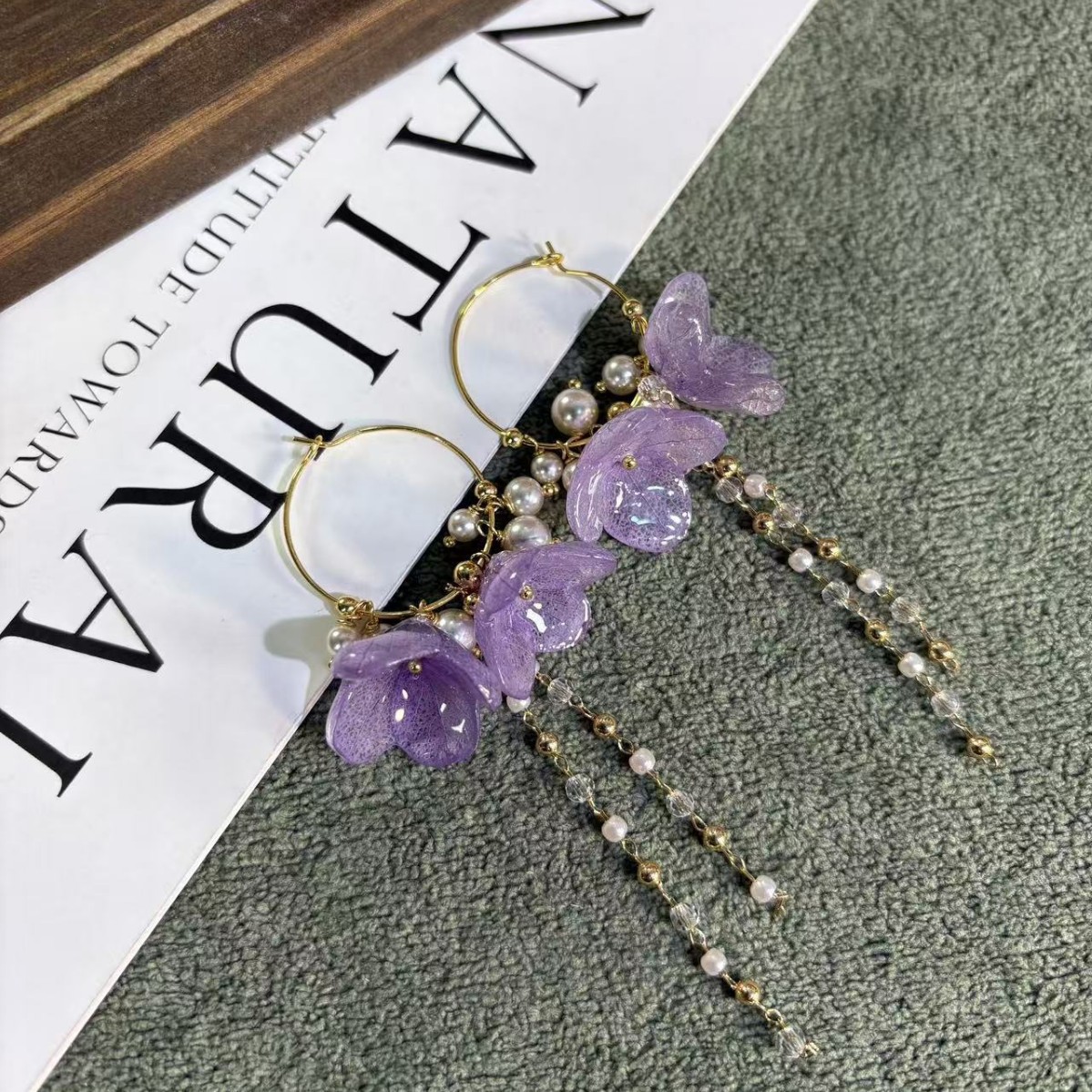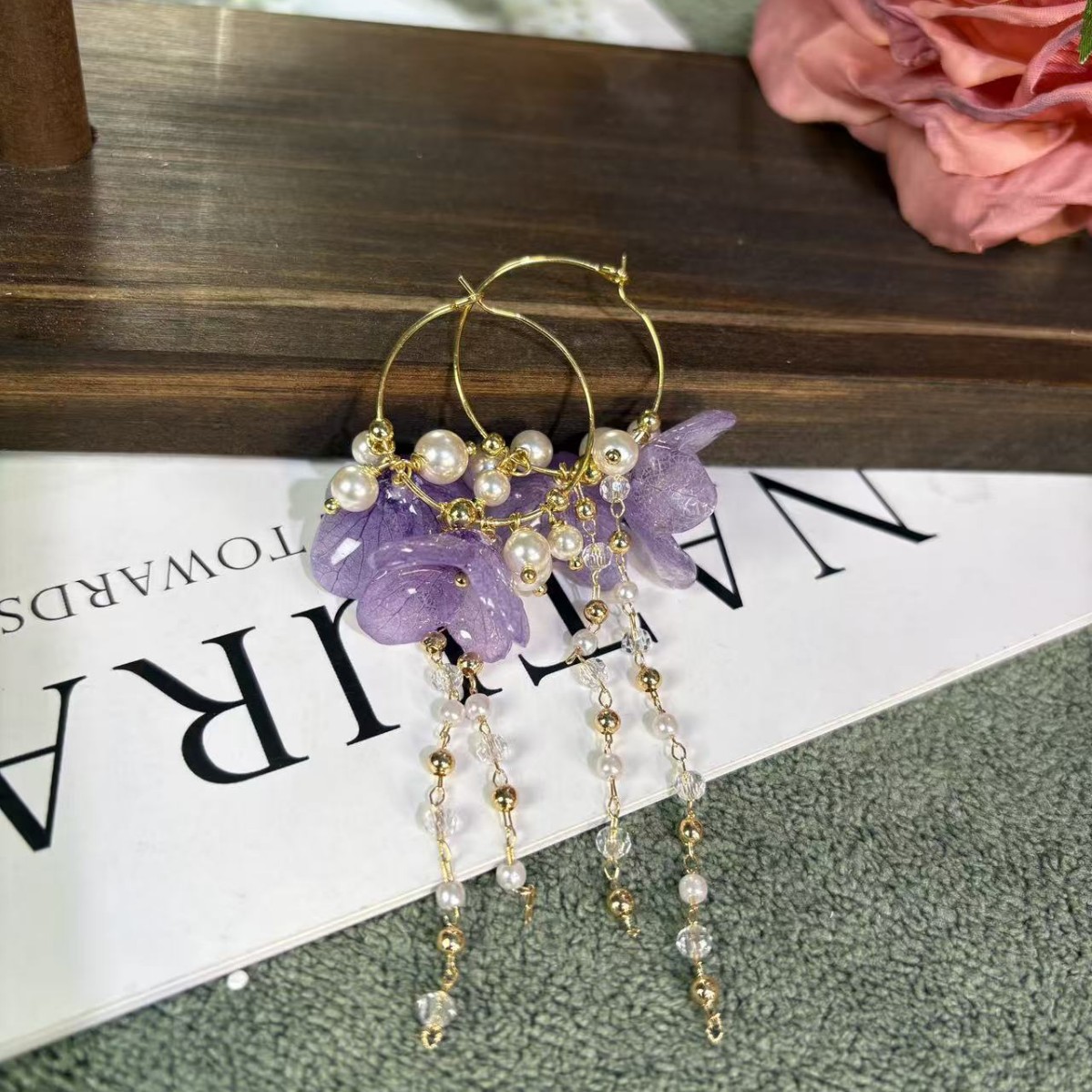 Handmade Hydrangea Resin Hoop Earrings - Dried Flower Tassel Drop Earrings