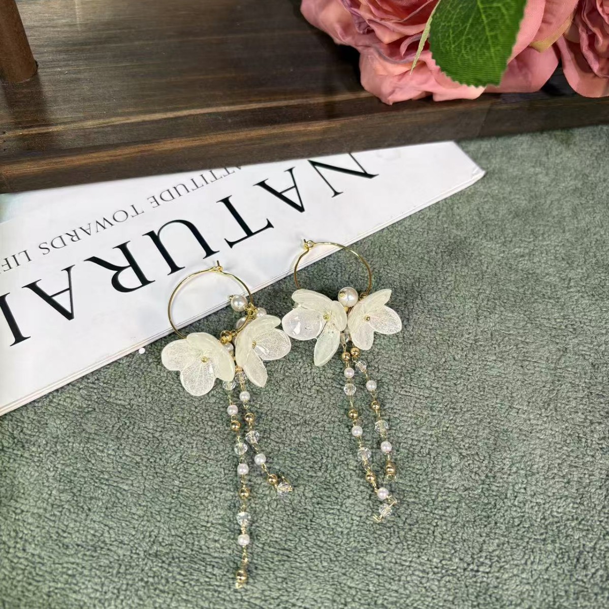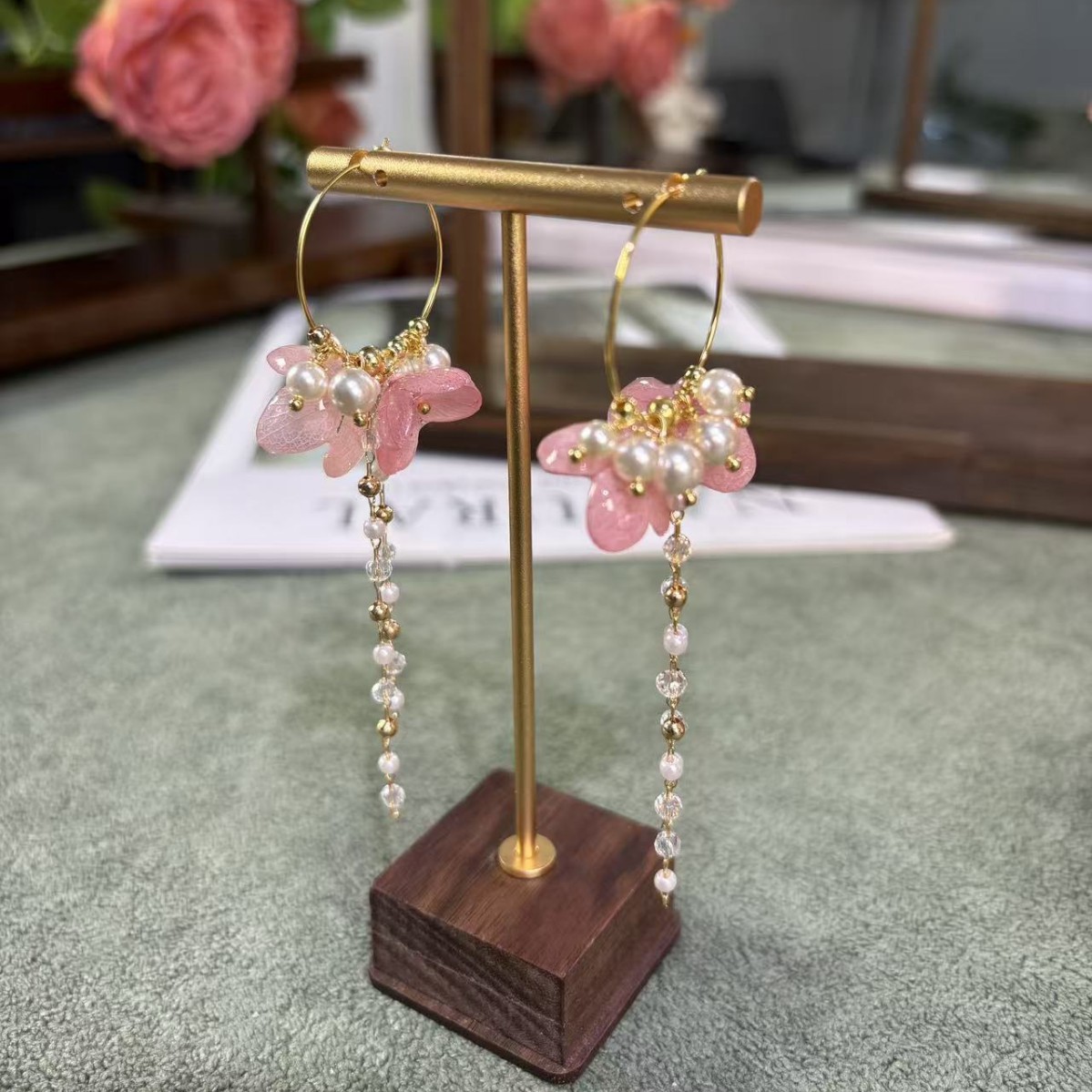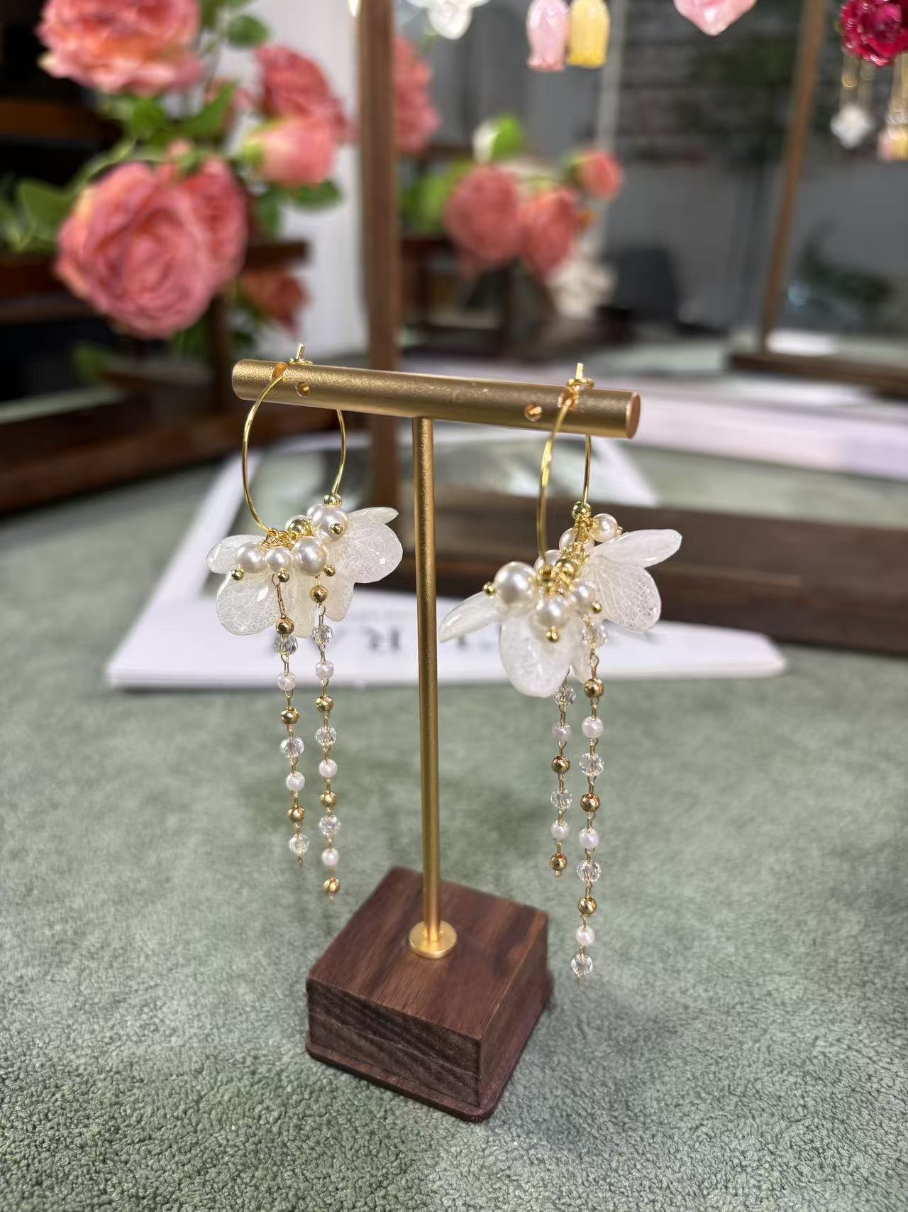Handmade Hydrangea Resin Hoop Earrings - Dried Flower Tassel Drop Earrings